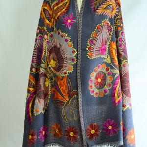 Hand-Embroidered Cashmere Scarf, Handmade Vintage Elegant Scarf, Soft Luxury Scarf With Flower Garden Embroidery